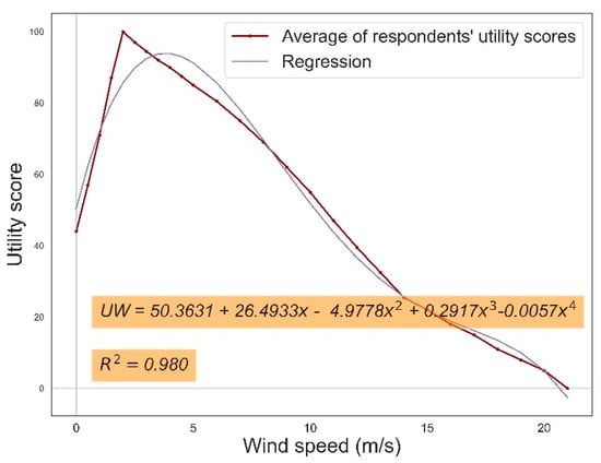 To develop a continuous utility function that can be applied for any wind velocity, the actual numerical wind speed values of the Beaufort scale assigned to each wind profile can be utilized, assuming that for a wind speed within the range of each of the five distinct wind profiles of Table 2 the utility score remains constant to the one calculated by Equation (24).