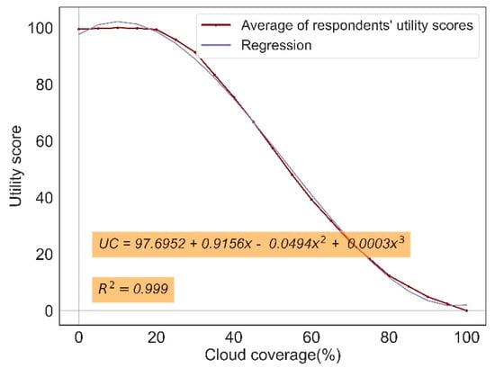 Respondents are invited to rate their preferred sky condition by indicating the ideal and unacceptable cloud coverage (Cidealm, Cunacm). The cloud coverage is presented to each participant in the survey in the form of percentages, with 0% indicating a clear sky and 100% indicating a complete overcast sky. The available choices are given in 10% interval steps and participants who do not indicate an unacceptable level of cloudiness are excluded from the calculation (since a 0 utility cannot be calculated for them). Once again, for each respondent, the utility scores for intermediate cloudiness values Cn between the stated as ideal (100%) and unacceptable (0%) are determined in a linear way as in the previous variables