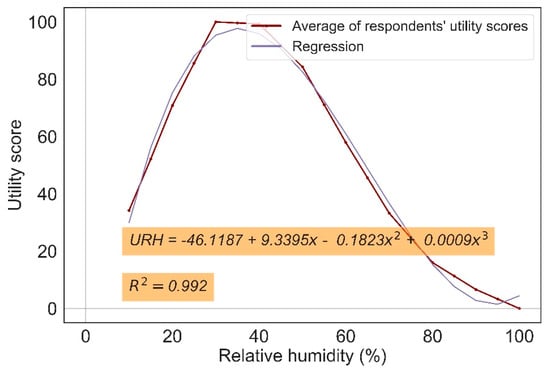 The equation of the utility function is a third-degree polynomial with a coefficient of determination of R2 = 0.992 and is valid for relative humidity values of 10–90%