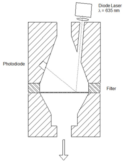 Layout of filter holder and optical module. The laser diode and the photodiode are positioned at 5° and 125°, respectively (relative to the perpendicular to the filter surface). The arrow marks the air flow direction.