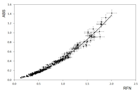 The design of the new instrument benefits of the experience gained during the development of the MWAA, the latter retrieves the sample absorbance at any available wavelength from the signals of three photodiodes positioned at fixed angles [22,23]. It’s the same scheme originally developed for the one-wavelength Multi Angle Absorption Photometer, MAAP [27]. So far, the analysis of the MWAA raw data led to a quantitative relationship between sample absorbance and light attenuation through the same filter sample [24,28]. To develop the new instrument, we assessed and exploited a relationship between sample absorbance (ABS) and reflectance (RFN). In our instrument, the photodiode is positioned at the same angle (θ = 125°, see Figure 1) of one of the two MWAA backward photodiodes. In this configuration, the non-linear relationship between ABS and RFN was retrieved by MWAA on a set of 240 PM samples collected on quartz and glass fiber filters and it is here reported in Figure 2. Samples exploited to deduce the calibration curve in Figure 2 came from several PM2.5/PM10 sampling campaigns performed in sites of different type (i.e., rural, urban and urban background sites, [23,24,29]). The relationship between ABS and RFN turned out to be very well described (i.e., R2 = 0.984) by the quadratic curve given in Equation (1):