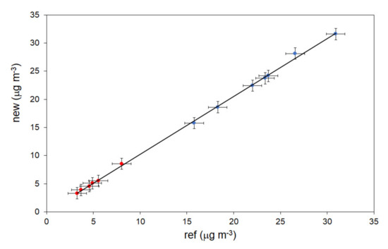 Intercomparison of the gravimetric PM2.5 (red points) and PM10 (blue points) concentration values measured on filter samples collected side-by-side by a standard (ref) and a new (new) sampler nearby an industrial site in Milan (Italy). The equation of the correlation curve is given in the text.