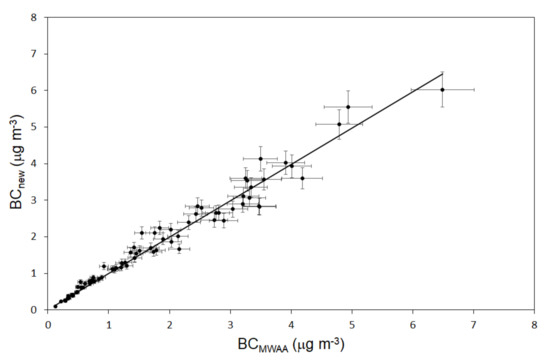 The second validation step was performed using two sets of daily PM10 samples (for a total of 76 quartz fiber filters) collected in spring 2019 in urban and urban background sites in the Italian cities of Bari, Genoa, and Milan, respectively. The instrument was equipped with a CEN PM10 inlet operated at an air flow of 2.3 m3 h−1. In this case, the BC concentration (daily average) was compared with the outcome of the off-line analysis of the same filter samples performed by the reference MWAA set-up (at λ = 635 nm only). The same MAC values were adopted in the two analyses and therefore the experiment directly compared the babs values retrieved by the new instrument and the full MWAA analysis [23]. The results are reported in Figure 4: the slope of the correlation curve turned out compatible with the unitary value; BCnew = (1.009 ± 0.012) BCMWAA; R2 = 0.988.