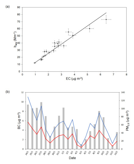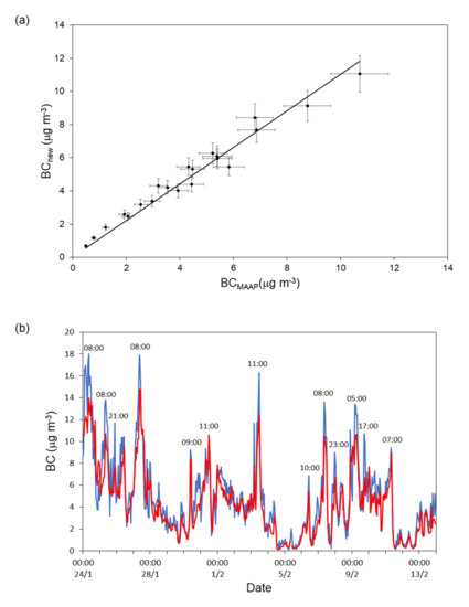 At the conclusion of the field campaign, the filter samples were analyzed retrieving first the gravimetric PM2.5 concentration and then the EC/OC content by a thermo-optical analysis using a SUNSET EC/OC instrument [21] operated with the EUSAAR_2 protocol [31]. In this way, the correlation between the daily mean of the babs values measured by new instrument and the EC concentration in PM2.5 could be studied (Figure 6a). The MAC value turned out almost double (MAC = 12.8 ± 0.3 m2 g−1) of the figure set in the MAAP but in the range of several other literature values ([18,22] and references therein) obtained at the same wavelength and, in some cases, in the same site (MAC = 10.4 ± 0.3 m2 g−1 [22]). With the site-specific MAC value set in our instrument, the BC concentration resulted about one-half of those delivered by the MAAP (Figure 6b) and its contribute to PM2.5 was (4.2 ± 1.3)%.