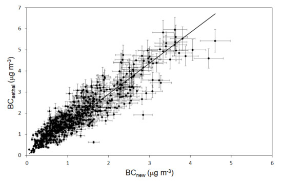 - Hansen, A.D.A.; Rosen, H.; Novakov, T. Aethalometer: An instrument for the real-time measurement of optical absorpion by aerosol particles. Sci. Total Environ. 1984, 36, 191–196. [Google Scholar] [CrossRef] [Green Version]