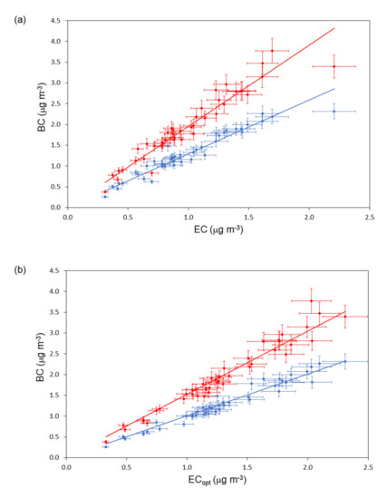 Correlation curve between the BC concentration values (12-h average) measured by our new instrument (blue points) and a 7-λ aethalometer (red points) with the EC (a) and the ECopt (b) concentration provided by the thermo-optical analysis of the PM10 samples. The equations of the correlation curves are given in the text.