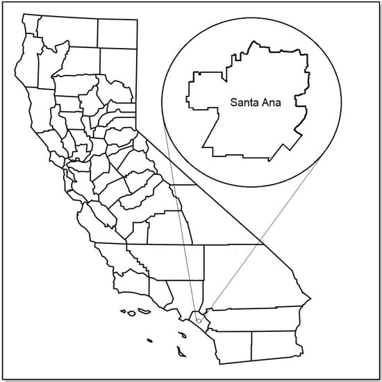 Santa Ana is a densely populated city located in Southern California in the southwestern region of the United States. It is the administrative center of Orange County, which is the sixth most populated county in the U.S. With a total population of approximately 337,716 residents, Santa Ana spans an area of 70.6 km2 and includes 61 census tracts [57]. In terms of population, Santa Ana ranks as the second largest city in Orange County and is the eleventh largest city in the state of California [57]. The majority of Santa Ana residents identify as Latina/o/x (77.3%), followed by Asian (11.4%) and white (9.4%), with a relatively high proportion (45.2%) of residents being immigrants [58]. As of 2019 the city includes 78,563 housing units and has a median household income of USD 65,313 (2018 dollars) [57]. A schematic showing the location of Santa Ana within the state of California is presented in Figure 1.