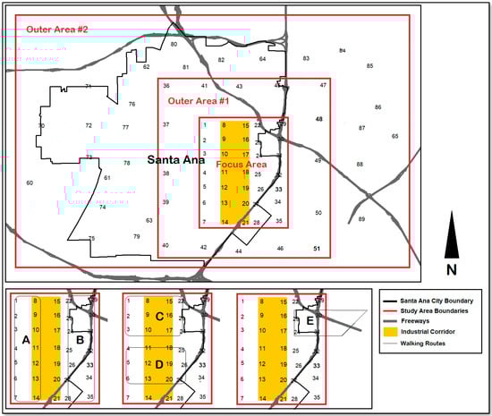 Map depicting regional sampling sites along with both the industrial corridor walking routes (A–D) and the freeway walking route (E).