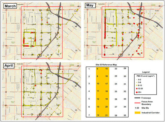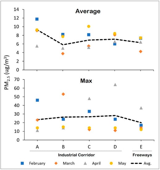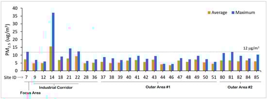 Figure 5 illustrates the February sampling day, where the average and/or maximum PM2.5 concentrations were found to exceed 12 μg/m3 across four sites within the Focus Area compared to zero sites outside of the Focus Area. This graph only includes sites that were successfully measured during all three sampling times within a day so as to avoid time-of-day sampling bias. As shown, site 14 appears to be anomalously high relative to other sites. This site was located within the Focus Area of the study region, which is immediately adjacent to the industrial corridor. Although Figure 5 only presents the February sampling day as an example, the May sampling day also showed one site (site 6) where the average and/or maximum PM2.5 concentration was elevated. Site 6 is also adjacent to the industrial corridor and was the only site where average and/or maximum PM2.5 concentrations were elevated across two separate monthly sampling days.