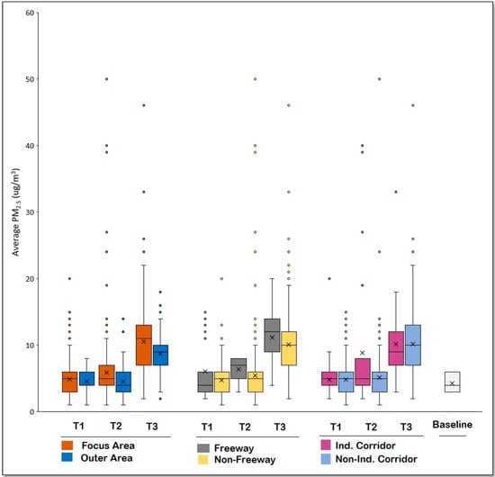 Boxplots of PM2.5 concentrations averaged across each time period (T1 = morning, T2 = midday, and T3 = evening) and relevant urban features for measurements collected on the February sampling day. The symbol “X” indicates average concentrations.