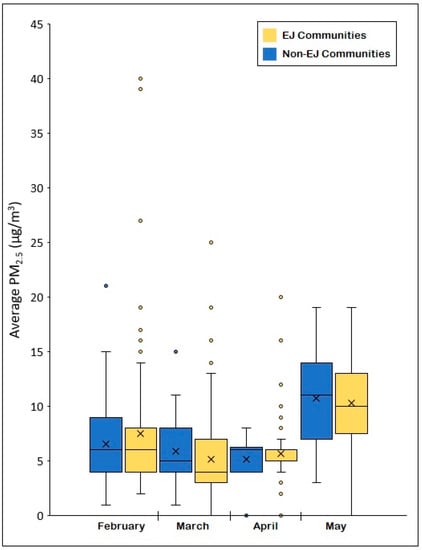 Figure 7 presents a boxplot of PM2.5 concentrations averaged across measurements collected within EJ communities and non-EJ communities for each of the four monthly sampling days. As shown, average concentrations were not considerably different between EJ and non-EJ communities, with each community designation reporting a relatively higher PM2.5 average for two of the four sampling days. For EJ communities, however, the boxplots consistently demonstrate a greater frequency of high-PM2.5 outliers relative to non-EJ communities.