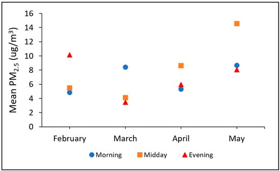 Figure 8 presents the average PM2.5 concentrations across each monthly sampling day and each sampling time period. As can be seen, average PM2.5 concentrations appeared to depend heavily on both sampling time and sampling day. Intraday variability ranged from approximately 4 to 9 μg/m3, which represented over a doubling in average PM2.5 in some cases. Similarly, intraday variability ranged from approximately 4 to 10 μg/m3. In the present study, the May sampling day had systematically higher PM2.5 concentrations.