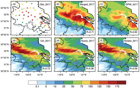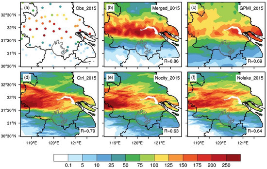 The distributions of the daily precipitation (unit: mm) for (a) the station observations, (b) the Merged, (c) the GPMI and (d–f) three simulations (control, Nocity, and Nolake) for EP925. The right-bottom R denotes the spatial correlation coefficients between the observation and the corresponding dataset.