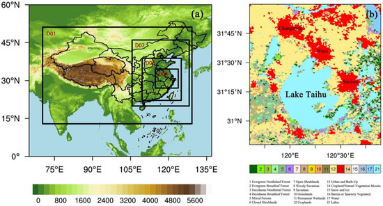 (a) The domains for WRF simulations and the terrain height for the outer domain (unit: m); (b) The land use of study area, derived from the 20-category IGBP-Modified MODIS.