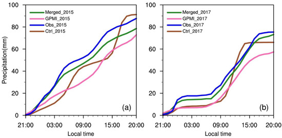 For the diurnal variation of the average hourly accumulated precipitation within the study area (Figure 4b), the Merged is the closest to the observation data. The curves of the control run and the observation data are relatively similar, although there are some differences to the observation data, which exhibit better results than GPMI in the hourly precipitation propagations. In general, the control run can basically reflect the overall precipitation spatial distribution and the variations in hourly precipitation in the study area.