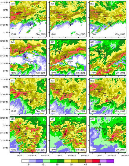 From the composite reflectivity detected by the radar, it is known that the shear line is located near Changzhou at 15:01 and starts to intrude into the study area, then arrives in Wuxi at 16:01, and finally moves to Suzhou at 17:00 (Figure 5a1–a3). The control run simulation generally follows the radar-detected the position of the shear line, but with a slightly higher intensity than the observation (Figure 5b1–b3).