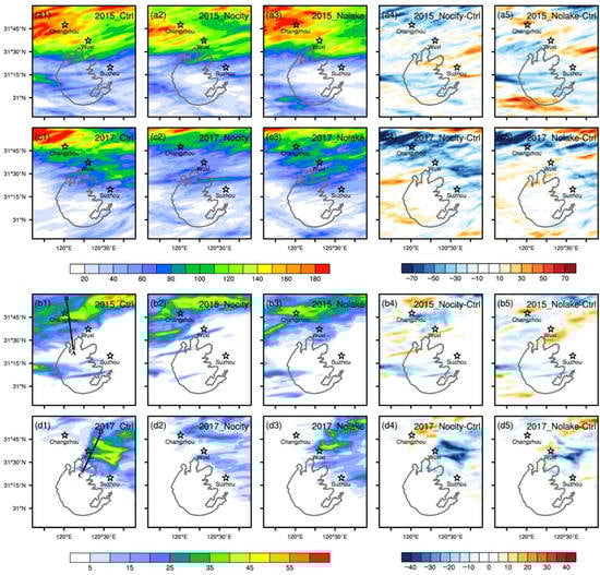 The control run simulates a significant precipitation to the northwest of Changzhou, with an intensity of about 180 mm (Figure 6c1). The precipitation belts of the Nocity and Nolake runs locate to the north of that in the control run (Figure 6c2,c3), resulting in lower precipitation at SXCMA than in the control run (Figure 6c4,c5). According to the results of the statistical analysis, when considering the average 24 h accumulated precipitation in the study area, the Nocity and Nolake runs have 15.9% and 7.3% less precipitation than the control run, respectively (Table 3).