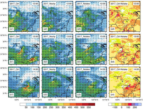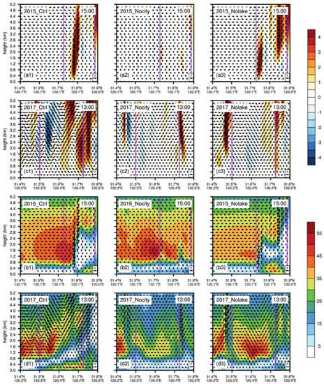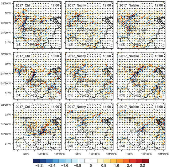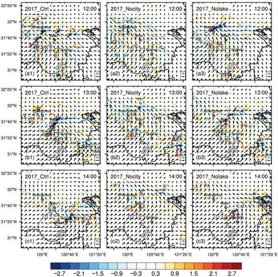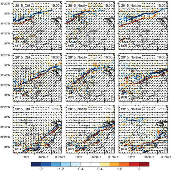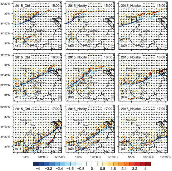 In the control run, LLSL is generated from Wuxi to the north side of Lake Taihu (Figure 7d1). A high wind speed center is formed in Wuxi, with an intensity of about 14m s−1. However, in Nocity, no clear wind speed center can be found (Figure 7d2). In Nolake, a high wind speed center in Wuxi is produced, but with a much lower intensity of only 10m s−1 (Figure 7d3). Corresponding to the LLSL, the SCL is moving from Changzhou to Suzhou with a intensity of −3.2 × 10−3 s−1 from 12:00–14:00 (Figure 10a1,b1,c1). By contrast, Nocity shows no explicit SCL (Figure 10a2,b2,c2), and Nolake is much weaker than the control run (Figure 10a3,b3,c3).
