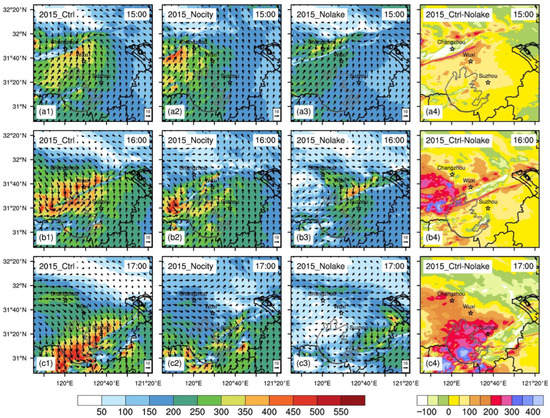 In terms of the distribution of water vapor in the low level, marked large water vapor fluxes near metropolises and lakes formed accompanied by the movement of the shear line in the control run (Figure 14a1,b1,c1). For Nocity, because no conspicuous shear line occurs, there is no large water vapor flux (Figure 14a2,b2,c2). A large value center of water vapor flux exists in Nolake (Figure 14a3,b3,c3), but its intensity and range are obviously inferior to the control run. This is evidently related to the loss of Lake Taihu, which leads to a decrease in water vapor in the lower level and in the intensity of the shear line. More specifically, with Lake Taihu, the control run produces 50 to 150 kg m−1 s−1 more water vapor flux around the lake in the lower levels than Nolake (Figure 14a4,b4,c4).
