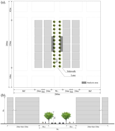 - Zou, H.; Xu, H.; Zhao, L.; Li, M. The Influence of the Geometric Characteristics of Street Valley on the Wind Environment. In Proceedings of the 11th International Symposium on Heating, Ventilation and Air Conditioning (ISHVAC 2019), Harbin, China, 12–15 July 2019; Wang, Z., Zhu, Y., Wang, F., Wang, P., Shen, C., Liu, J., Eds.; Springer: Singapore, 2020; pp. 989–997. [Google Scholar]