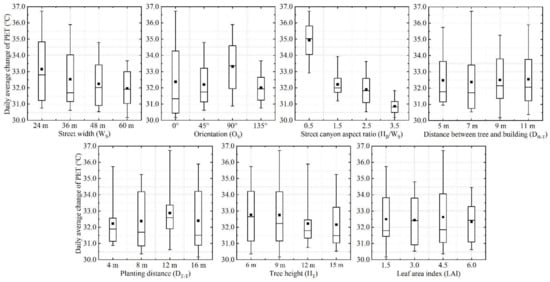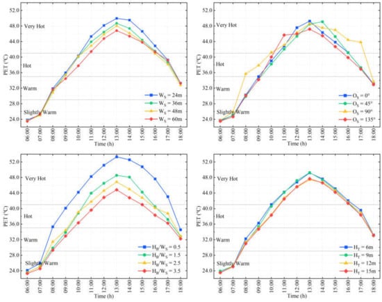 3.2. Characteristics of Changes in the Street Thermal Comfort (PET Index) on the Pedestrian Level
