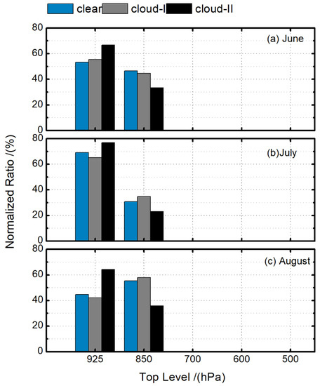 Figure 4 displays the normalized ratios of the pressure levels where the temperature inversion peaks (or as inversion tops) in the Arctic during the summer months for three defined inversions. The results based on the AIRS profiles show that the temperature inversion top in the Arctic summer generally occurs at the levels of 925 and 850 hPa. The distribution of the inversion peak levels varies from June to August. In June, the ratios of the top at 925 hPa for all the three inversions are higher than those at 850 hPa. In July, the ratios of inversion top at 925 hPa increase significantly to about 60–80%. In August, the ratios at 925 hPa decreased for all the three inversions. Moreover, for the “clear” and “cloud-I” inversions, the ratios at 925 hPa drop below 50%, which are lower than those at 850 hPa. Generally, the “cloud-II” inversions are more likely to peak at 925 hpa in the Arctic summer. For the “clear” and “cloud-I” inversions, the inversion tops vary from June to August.