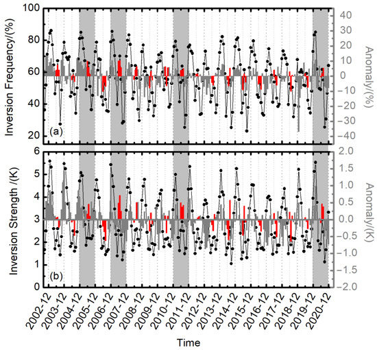 Time series (dots and lines) and corresponding anomalies (bars) for monthly temperature inversion (a) frequency and (b) strength for all the inversions in the Arctic. Red bars represent the anomalies of the Arctic summer (June to August); gray bars represent the anomalies of the rest months. The light gray shades mark the years with positive anomalies of both frequency and strength during summer.
