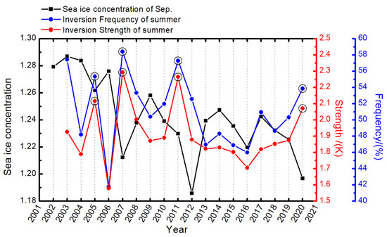 Figure 6 shows the multiyear change of the mean frequency and strength of summer inversions and the September sea ice concentration, provided by the National Snow and Ice Data Center (NSIDC) [40,41]. The result reveals that when the frequency and strength of summer inversions are both with high values (corresponding to the positive anomalies in Figure 5), there would be a drop in sea ice concentration in September. According to the monthly sea ice concentration data from NSIDC, the Arctic sea ice recorded three significant low values, in 2007, 2012, and 2020, respectively. Figure 6 shows that the frequency and strength of inversions in summer of 2007 and 2020 are both at high levels, except for the year 2012.