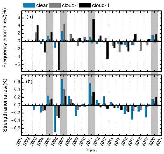 Figure 7 further displays the summer temperature inversion anomalies of frequency and strength for the “clear”, “cloud-I”, and “cloud-II” inversions. The results show that the positive summer anomalies are from different inversion types. For the inversion frequency (Figure 7a), the positive summer frequency anomalies were mainly from “cloud-I” and “clear” inversions in 2007. While, in 2005 and 2020, it was dominated by “clear” and “cloud-II” types. In 2011, the positive summer anomalies were primarily due to the “cloud-II” inversions. For the inversion strength (Figure 7b), the “clear” inversion anomalies were dominant in summer in 2005, 2007, and 2011. While, in 2020, the “clear” and “cloud-II” positive anomalies were comparable.