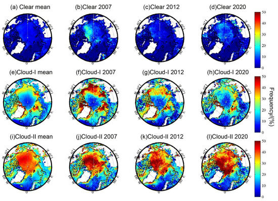 Comparisons of the temperature inversion frequency from June to August in the Arctic between (a,e,i) multi-yearly mean, (b,f,j) 2007, (c,g,k) 2012, and (d,h,l) 2020; (a–d) represent the “clear” inversions; (e–h) represent the “cloud-I” inversions; (i–l) represent the “cloud-II” inversions.