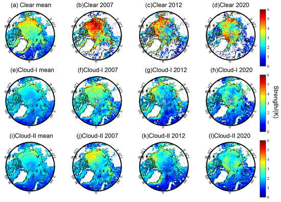 Comparisons of the temperature inversion strength from June to August in the Arctic between (a,e,i) multi-yearly mean, (b,f,j) year 2007, (c,g,k) year 2012, and (d,h,l) year 2020. (a–d) represent the “clear” inversions; (e–h) represent the “cloud-I” inversions; (i–l) represent the “cloud-II” inversions.