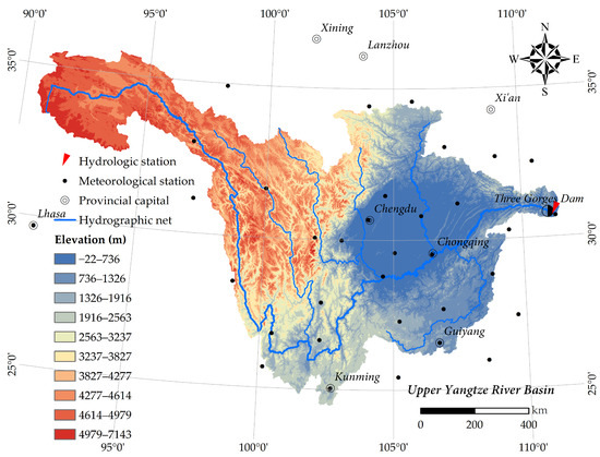 Topographic map of the upper Yangzte River basin (UYRB) and distribution of gauging stations.