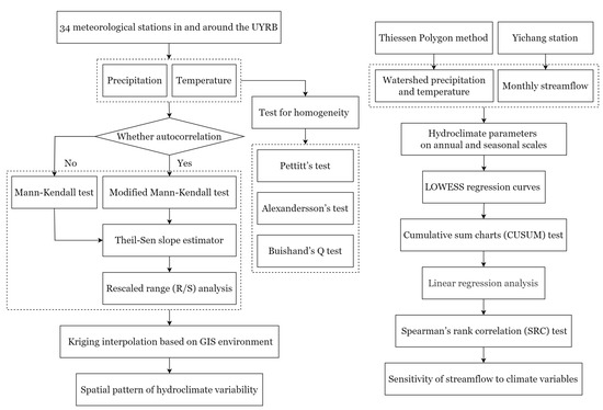 Spatial variability in the long-term behavior of climate is dependent on regional and local characteristics [16]. Climate trends at the regional scale are by no means easy to detect, since regional climate has relatively greater variability associated with natural climatic processes [35]. Autocorrelation is recognized to be quite common in temperature and precipitation time series and may affect the computation of linear trends [55]. This study attempts to produce more reliable estimates of trend magnitude and the statistical significance by taking into account the autocorrelation detected in climate time series. Sequentially to this, conducting relatively small-scale analyses and a check for inhomogeneity are of great importance to avoid biases, spurious trends and erroneous interpretations from the data series used for such analyses [16]. In view of this, this paper focuses on investigating the trends and homogeneities in hydroclimate series in the UYRB to analyze whether there are significant trends and long-term movements (i.e., jumps in the mean) in precipitation and temperature as previous studies of this basin did not focus on this. This study also focuses on whether there is a Hurst phenomenon in watershed-scale climate variables to estimate the persistence of future trends. In addition, the sensitivities of runoff as a vital hydrological variable to long-term climatic parameters are also focused in this study. This study is necessary since the enormous importance of the basin to sustaining the livelihood of the inhabitants and also its general water resources contribution to the well-known Three Gorges Dam.