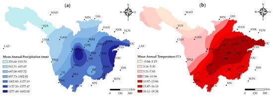 The latitude and longitude of the selected meteorological stations and their codes are provided in Table A1. The spatial mean annual rainfall and air temperature variation across the UYRB is shown in Figure 3. The difference in rainfall between the northwest and southeast of the watershed seems to be considerable, as seen in Figure 3a, which is in accordance with the analysis of [62,67]. As reported by [62], the spatial distribution of precipitation over the UYRB is extremely heterogeneous, and in general, the rainfall decreases from the southeastern to the northwestern part of the basin. The mean annual temperature has almost the same spatial changing pattern as rainfall, increasing from the northwest (Tibet Plateau) to the southeast (Sichuan Plain) of the watershed. Due to the impact of the complex topography in the UYRB on climate [62], the climate in the basin shows some differences in space, providing a premise for this study.