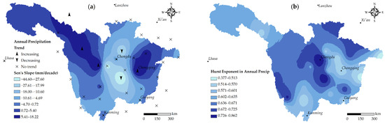Spatial distribution of (a) trend magnitude and significance and (b) Hurst exponent in annual and seasonal precipitation over the UYRB during 1951–2020.