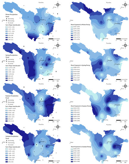 On the annual scale, Figure 5 shows significant increasing trends (at 95% confidence interval) in mean temperature for almost the entire basin, except for Guiyang station, over the period of record. On the basis of the seasonal scales, the magnitude of the mean air temperature in the winter, summer and autumn seasons change (increase trend) has decreased from the western part to the eastern part of the whole basin. The highest slope of temperature increases occurred at high altitudes (Tibetan Plateau). In contrast, temperature increases at lower elevations such as the eastern part of the basin were smaller. With the exception of a few stations in the eastern basin, no downward trend in temperature was observed, and significant temperature increases were observed almost throughout the basin. As can be seen from the Hurst exponent charts, the winter mean temperature in the western basin will continue to increase in a high range in the future, with a Hurst value of around 0.75. The trend of the spring mean temperature in the northern and central parts of the basin will continue, that is, the spring temperature in the northern part seems to increase significantly in the future. The mean autumn temperature in the central part of the catchment (Sichuan Plain) will continue the trend of the past 70 years, with the Hurst exponent of about 0.85. Overall, the Hurst value of the mean air temperature is almost in range of 0.50–1, indicating that the temperature in the whole basin may continue to increase significantly in the future, especially in the high altitude area (Qinghai–Tibet Plateau).