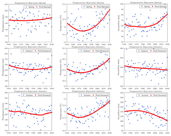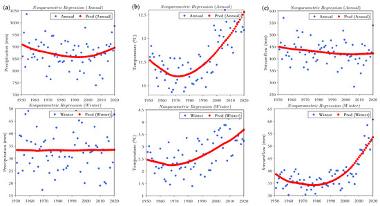 LOWESS regression line for (a) precipitation, (b) temperature, and (c) streamflow on annual and seasonal scales over the UYRB. Pred means prediction.