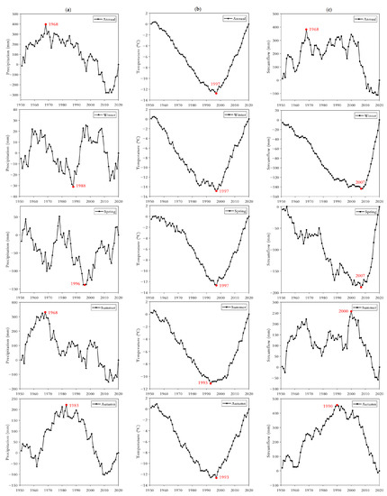 CUSUM charts of (a) precipitation, (b) temperature and (c) streamflow on annual and seasonal scales over the UYRB during 1951–2020.