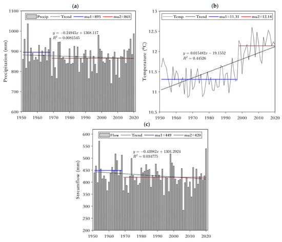 Time series of annual (a) precipitation, (b) temperature and (c) streamflow and linear trend over the UYRB during 1951–2020. Mu1 denotes mean before mutation; mu2 denotes mean after mutation.