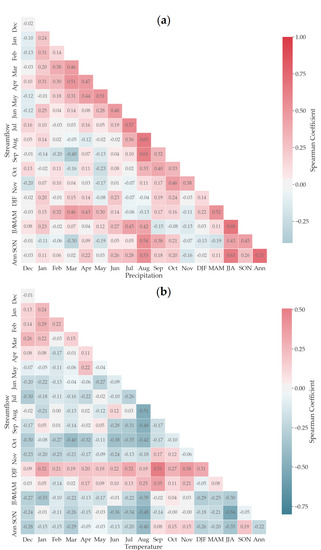 To identify the sensitivity of runoff to climatic factors (precipitation and temperature) at different time scales, the Spearman’s rank correlation test (SRC) was performed for monthly, seasonal and annual time series. The results of the Spearman coefficient between precipitation and streamflow (temperature and streamflow) are shown in Figure 9a,b, among which DJF means winter, MAM means spring, JJA means summer and SON means autumn.