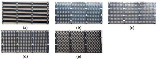 Segment models of wind barrier: (a) barrier strips; (b) round holes; (c) square holes; (d) elliptical holes in an equidistant arrangement; (e) elliptical holes in a staggered arrangement.