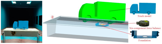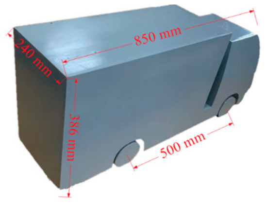 When they encounter lateral crosswinds, vehicles on bridges are prone to side slips, and large vehicles, such as trucks, might roll over or experience other severe accidents. In this work, a truck model was designed and fabricated for the wind tunnel tests. The truck model was made of resin, and the geometric model used a scale ratio of 1:10, which was consistent with the box girder and bridge wind barrier, as shown in Figure 3.