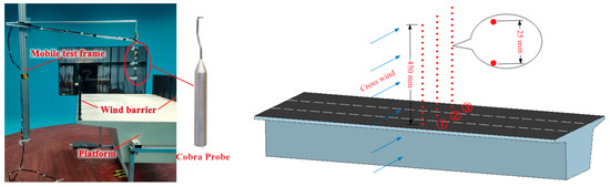 In the speed test, the TFI Cobra three-dimensional pulsating anemometer was used to measure the height of the vehicle model near the centerlines of lanes ①, ②, and ③; that is, the wind speed profile at a height of 0–45 cm. The intervals between the measurement points, the sampling frequency, and the duration were 2.5 cm, 600 Hz, and 60 s, respectively. Figure 4 shows the layout of the measurement points.