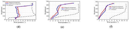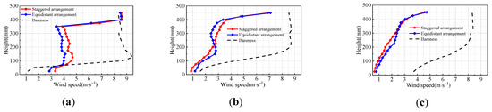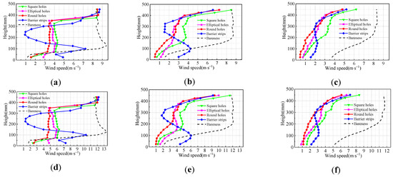 Figure 6 shows the average wind speed profiles of each lane for the three wind barrier conditions (no wind barrier, behind the wind barrier of the staggered arrangement, and behind the wind barrier of the equidistant arrangement) at two wind speeds. Figure 6 reveals that the average wind speed at each measurement point increased as the incoming wind speed increased. Under different wind speed conditions, the wind speed behind the wind barrier had the same reduction trend for different hole arrangements; that is, the shielding effect of the hole arrangement on the lanes behind the wind barrier did not change significantly with increases in the incoming wind speed. In Lane 1, the holes were arranged equidistantly, and the corresponding wind speed in the height range of 0 to 35 cm was lower than that in the staggered arrangement. The wind shield effect of the equidistant arrangement on Lane 1 was better than that of the staggered arrangement. In Lane 2 and Lane 3, there were no significant differences in the wind shield effect of the equidistant and staggered arrangements. In the most unfavorable situation, the wind shield effect of the equidistant hole arrangement was better than that of the staggered arrangement. In general, the hole arrangement does not have a significant impact on the wind shield effect of the wind barrier. Because the equidistant hole arrangement slightly improved the wind shield effect of the wind barrier, and because its production and processing are relatively simple, the remainder of the schemes were carried out with a uniformly distributed arrangement.