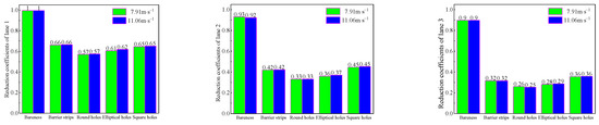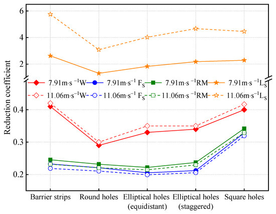 Figure 8 shows a comparison of the reduction factor of different wind barriers under two different wind conditions of 7.91 m∙s−1 and 11.06 m∙s−1.