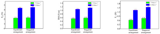 Figure 10 shows that different arrangement schemes can greatly reduce the lateral force and roll moment of the truck. Although the equidistant arrangement can improve the safety of trucks traveling over bridges to a certain extent, its value is not considerably different from the scheme using the staggered arrangement, which shows that the hole arrangement has little effect. In addition, the wind barrier roll moment and lift values were smaller in the equidistant arrangement; therefore, the equidistant arrangement is beneficial to the stability of trucks driving over bridges, which is consistent with the wind test results.