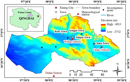 Figure 1. Geographic location of Wulan County and distribution of meteorological stations in study area.