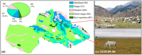 Figure 2. (a) Vegetation map of Wulan County, and area proportions of different vegetation types. (b,c) Photos of the pasture in Wulan County.