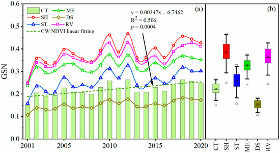Figure 3. (a) Yearly changes in growing season NDVI (GSN) of Wulan County and each vegetation type in Wulan County from 2001 to 2020; (b) Distributions of GSN values from 2001 to 2020. CT, SH, ST, ME, DS, and RV represent county, shrubland, steppe, meadow, desert steppe, and rest vegetation, respectively.