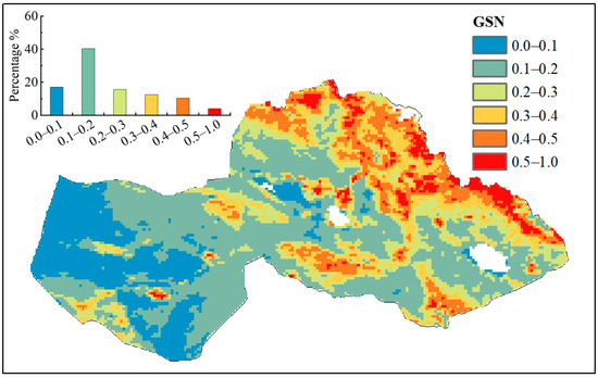 Figure 4. Spatial distribution of the multi-year mean values of growing season NDVI (GSN) from 2001 to 2020.